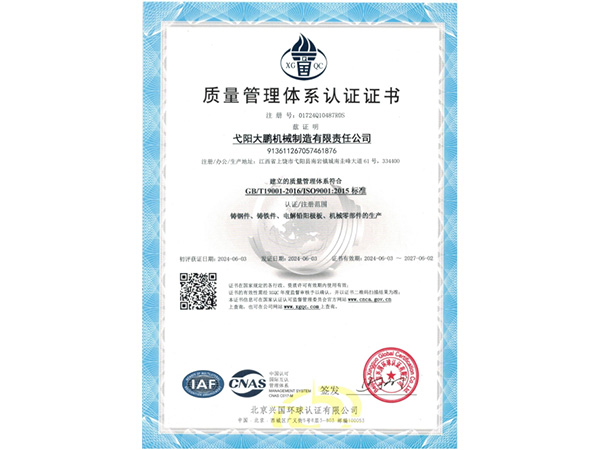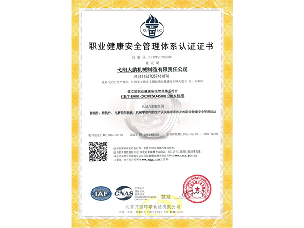 公司順利通過質(zhì)量管理體系認證、環(huán)境體系認證、職業(yè)健康安全管理體系認證、環(huán)評。2015年5月獲國家工信委頒發(fā)的《鑄造企業(yè)準入條件》;2019年做了安全現(xiàn)狀評價;2020年取得了排污許可證。